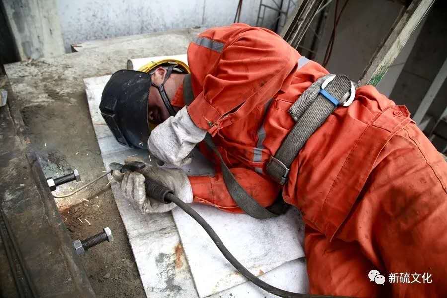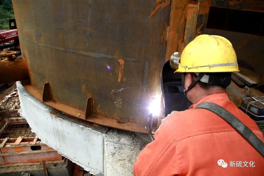 地面上大吊車、大貨車,選礦廠相關(guān)負(fù)責(zé)人、技術(shù)人員、安全員等忙著起吊龐然大物時,“焊高組”在底座上也一刻沒閑著,拖運電焊設(shè)備、準(zhǔn)備焊接材料、在底座上鋪水泥保持平面,各個槽體支腳找平衡......由于底座緊挨著磨浮車間,空氣不流通,加上天氣悶熱難擋,武裝整齊的好“焊”們一會就汗?jié)窳斯ぷ鞣?,汗珠順著安全帽壓著的發(fā)根往下滾。